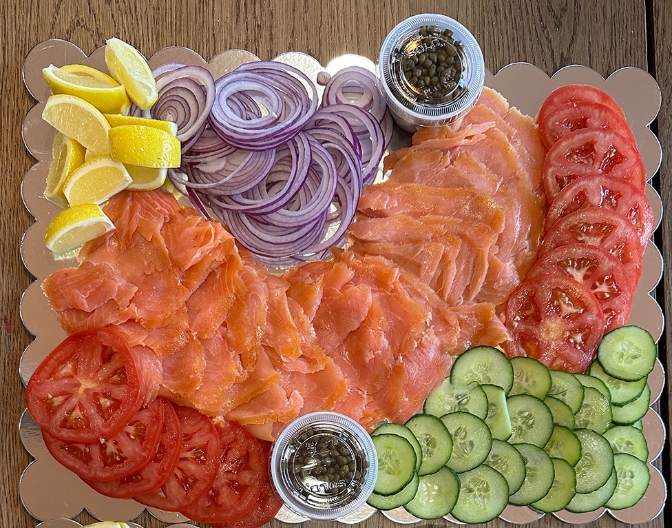 Nova Lox from Brooklyn with cream cheese, sliced red onion, sliced tomato, and capers.